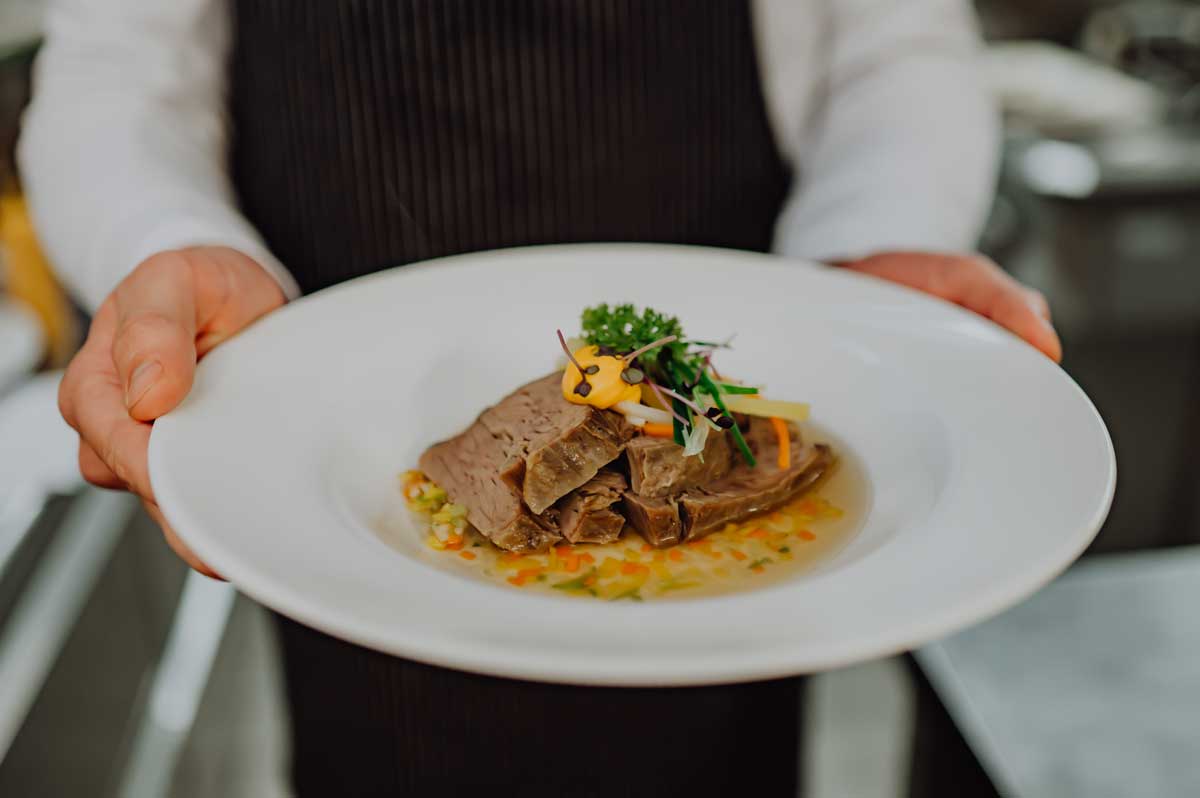 Gesottenes vom Jungbullen zum Satt-Essa, mit Gemüse in der Terrine serviert, dazu Bratkartoffel, Rote-Beete-Salat und Meerrettichsoße.