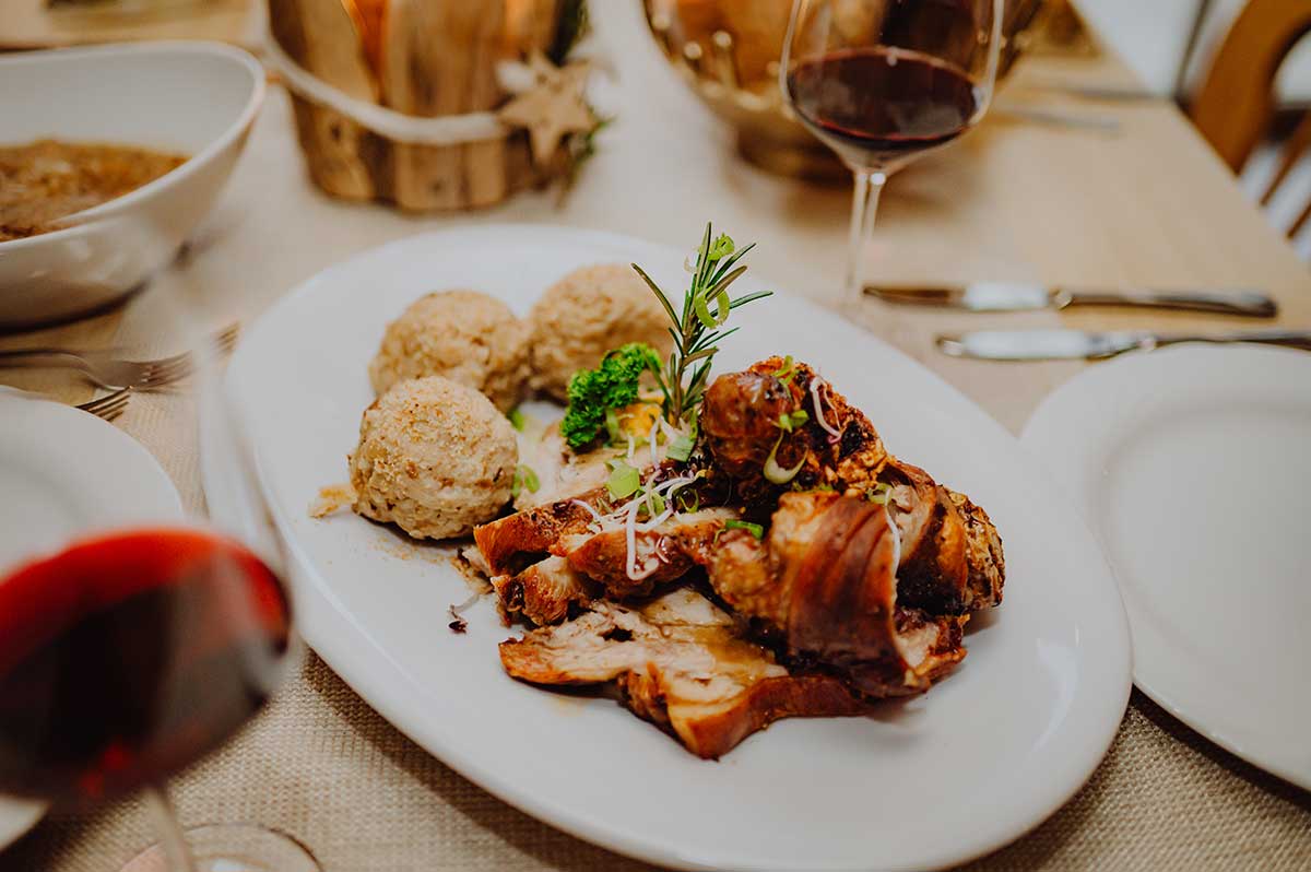 Wir servieren Spanferkel mit Sauerkraut, Knödel und unser leckeres hausgemachtes Bauernbrot.